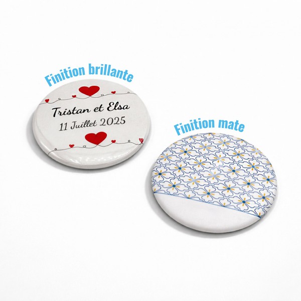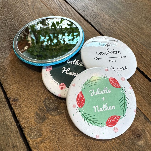 Le badge miroir personnalisé 75 mm offre un excellent équilibre entre visibilité et praticité. Ce miroir rond personnalisé permet d’intégrer prénom, date ou visuel détaillé. Idéal pour mariage, baptême ou événement associatif, il constitue un souvenir utile et esthétique que vos invités conserveront longtemps.