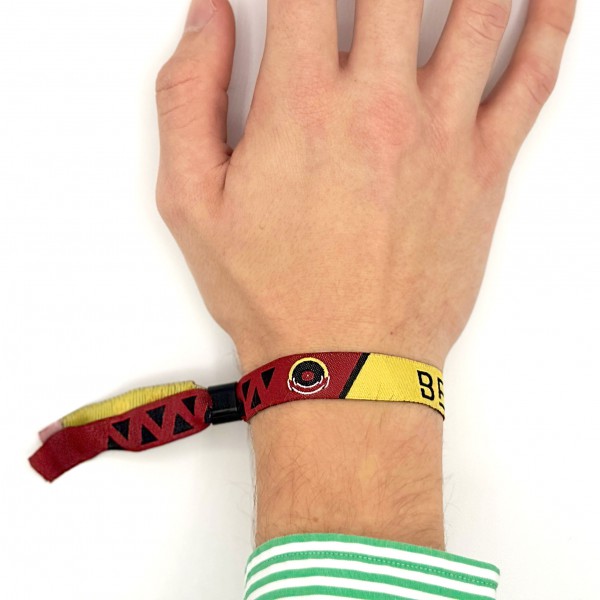 Bracelet textile personnalisé par tissage. Parfait pour les logos et visuels simples (jusqu’à 3 couleurs), il offre un excellent confort, une grande résistance et un fort pouvoir de notoriété, et est souvent conservé comme souvenir de l’événement.