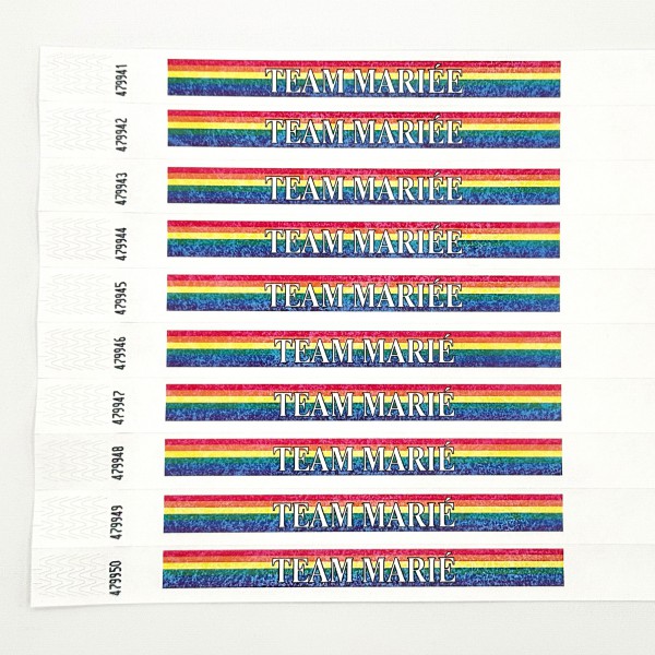 ChèqueBracelet Tyvek blanc personnalisé en impression quadri couleur, idéal pour une communication visuelle forte sur des événements de courte durée. Inviolable, indéchirable et numéroté, parfait pour le contrôle d’accès 24/48 h.